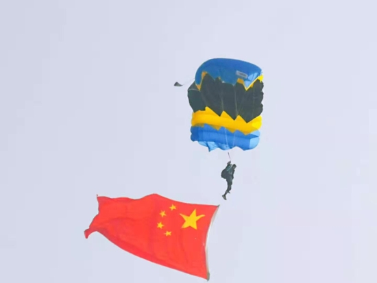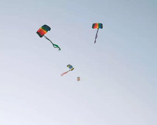 “看,跳傘表演開始了。”10月29日上午,周口西華通用機場首航儀式結束后,一場精彩絕倫的飛行表演就開始了。載著跳傘運動員的飛機起飛到指定地點后,運動員攜帶著國旗和彩帶從高空中跳下,打開傘包后,空中五顏六色十分漂亮,引得圍觀群眾不時叫好。
