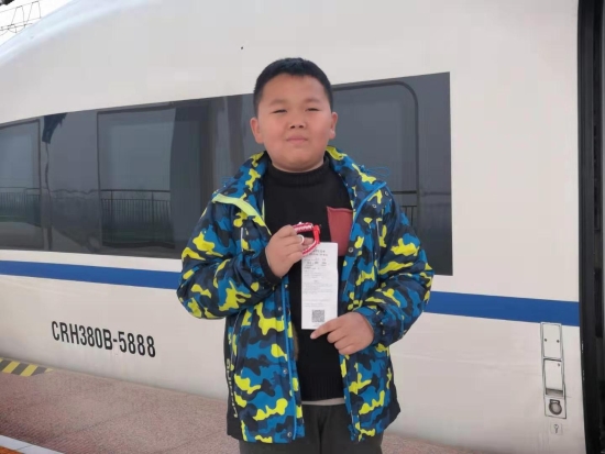 “沒事,不急,我和媽媽一起等俺爸來接。”小朋友拿著自己的高鐵票,讓記者給他拍照留下這次快樂的記憶。
