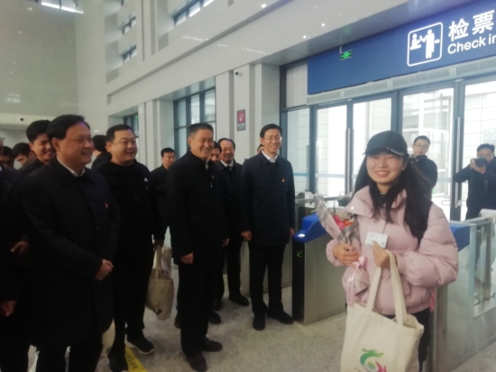 中午12時43分,呼嘯而至的G6655作為首趟列車準(zhǔn)點駛進(jìn)淮陽南站,90多位乘客依次興沖沖地走下列車?;搓柨h委書記馬明超、縣長王毅等為率先走出出站口的乘客代表送上布藝泥泥狗等禮物,歡迎他們乘坐首趟高鐵列車回家。
