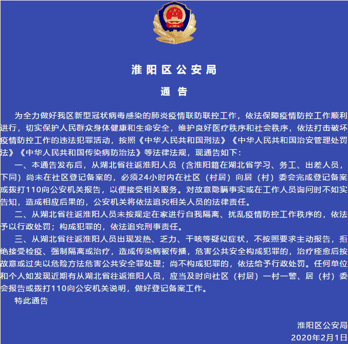 今天,淮陽區(qū)公安局發(fā)通告:從湖北返淮人員務(wù)必24小時內(nèi)……