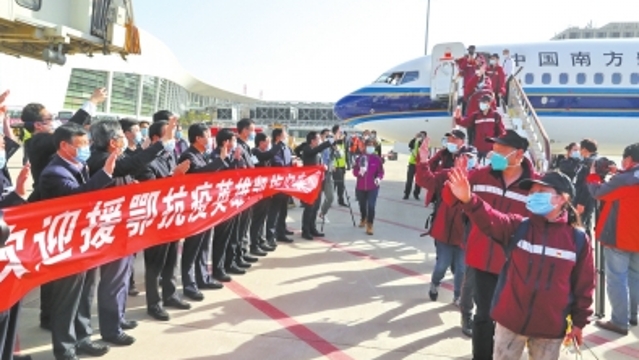 3月30日上午,湖北武漢,《歌唱祖國(guó)》響徹云霄。鄲城縣援鄂抗疫的5名醫(yī)護(hù)隊(duì)員隨河南醫(yī)護(hù)隊(duì)一道,完成使命、起程凱旋,今天下午到周口。