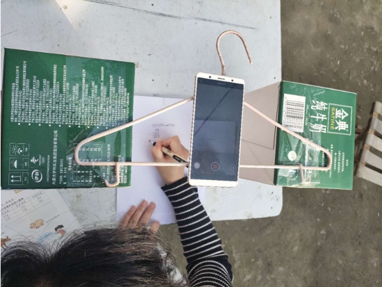 在備課時,朱霞很快遇到了難題:手機沒法固定,街上手機店又全部停業(yè),網(wǎng)上買的手機固定夾發(fā)不了貨。為了不耽誤學生上課,她想到用晾衣?lián)?、牛奶箱做成簡易支架,組裝后居然效果不錯。就這樣,一個晾衣?lián)巍蓚€牛奶箱和一部手機組成了她的“三尺講臺”。