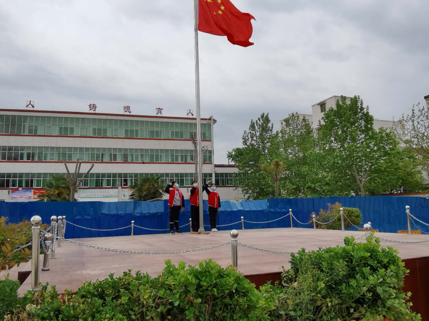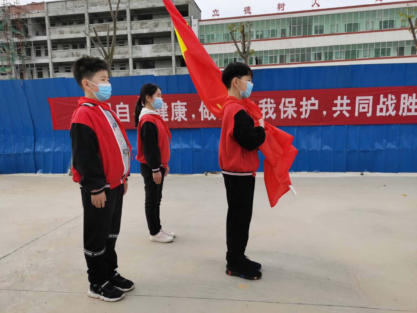 這是一次特殊的升國(guó)旗儀式,三名國(guó)旗手在操場(chǎng)上將五星紅旗冉冉升起,升旗實(shí)況同步轉(zhuǎn)播到教室內(nèi)的電視屏幕上,同學(xué)們?cè)诟髯越淌依锩嫦驀?guó)旗莊嚴(yán)肅立、齊唱國(guó)歌,面向國(guó)旗敬禮,在國(guó)旗下立下一個(gè)志,將來成為一個(gè)對(duì)社會(huì)有貢獻(xiàn)的人,能夠?yàn)樯鐣?huì)做出突出成績(jī)的人。