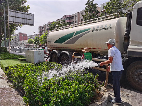 6月4日,園林工人在市區(qū)七一路為綠化帶內植被澆水“解渴”。近期我市持續(xù)高溫天氣,為應對連續(xù)高溫,綠化部門加大對綠化樹木的澆灌灑水頻次,為城區(qū)的花草樹木“消暑”, 確保綠化植物的存活率。