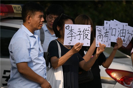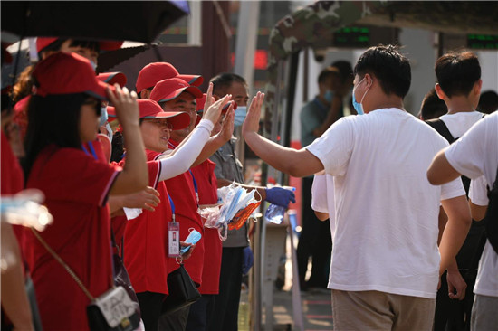 祝愿學(xué)子們考出好成績,今夏實現(xiàn)金榜題名,是全社會共同的心聲。7月7日上午8點多,2020年高考開啟神圣時刻,和往年不同的是,因疫情影響,學(xué)子們帶著口罩入場,作為外援的家長們,更是悉數(shù)趕到考場外,為孩子們加油!而辛勤一年的老師們,更顧不上歇一會兒,也趕到考場外,為學(xué)生擊掌打氣,構(gòu)成周口考場外動人的圖景。圖為市一高考場外的家長們舉著加油的牌子,為孩子助威!一高的老師穿上小紅馬甲,當(dāng)志愿者,和進場的學(xué)生擊掌助威!