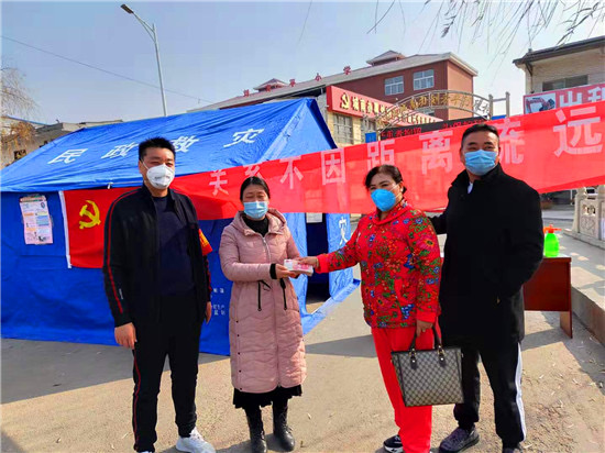 防疫物資緊缺是開展防疫工作面臨的共同難題。王七峰在防疫工作開始后,第一時(shí)間向城南辦事處捐助資金5萬元,并發(fā)動(dòng)親屬積極捐款,其三哥王永紅捐助資金2萬元支持城南辦事處疫情防控工作,14歲的侄子王璽博也將自己的5000元壓歲錢捐了出來,為抗擊疫情助力。之后,王七峰除了統(tǒng)籌村里的防疫工作外,每天早上6點(diǎn),還會(huì)準(zhǔn)時(shí)到村里各個(gè)防控點(diǎn)或巡查或值守,始終堅(jiān)守在排查登記、區(qū)域防控第一線。有了王七峰的帶頭表率,該村的干部、黨員、志愿者紛紛加入抗疫隊(duì)伍中來,村民們也是有錢出錢、有力出力,大家眾志成城,有效落實(shí)了聯(lián)防聯(lián)控、群防群治的各項(xiàng)措施。