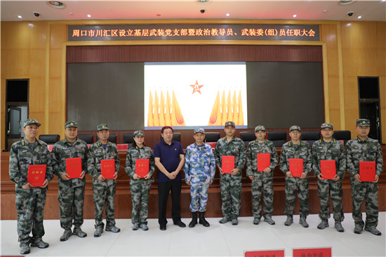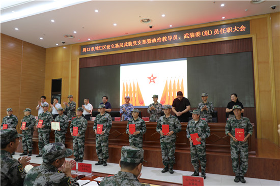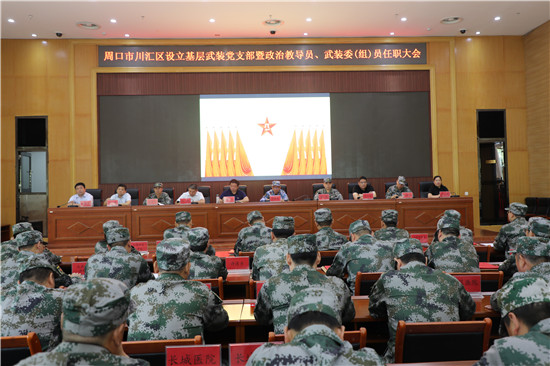 黨管武裝建設國防,軍民攜手共筑長城。為健全武裝工作組織領導體系為推動國防動員和后備力量建設在基層末端落實,7月16日上午,周口市川匯區(qū)召開基層武裝黨支部暨政治教導員、武裝委(組)員任職大會。周口軍分區(qū)司令員湯維政,區(qū)委書記、區(qū)人武部黨委第一書記李宗喜,市委組織部處級干部宋陽,區(qū)人武部政委高新傳、部長陳繼芳及城鄉(xiāng)一體化示示范區(qū)、經濟開發(fā)區(qū)、港口物流產業(yè)聚集區(qū)等有關負責同志參加了大會。會上設立了18個基層武裝黨支部,任命了15名基層武裝部政治教導員、20名村(社區(qū))武裝委(組)員任職命令,武裝部政治教導員、武裝預建黨支部書記和兼職武裝委(組)員代表先后作了履職承諾發(fā)言,湯維政等為新任命的人員頒發(fā)了任職證書。