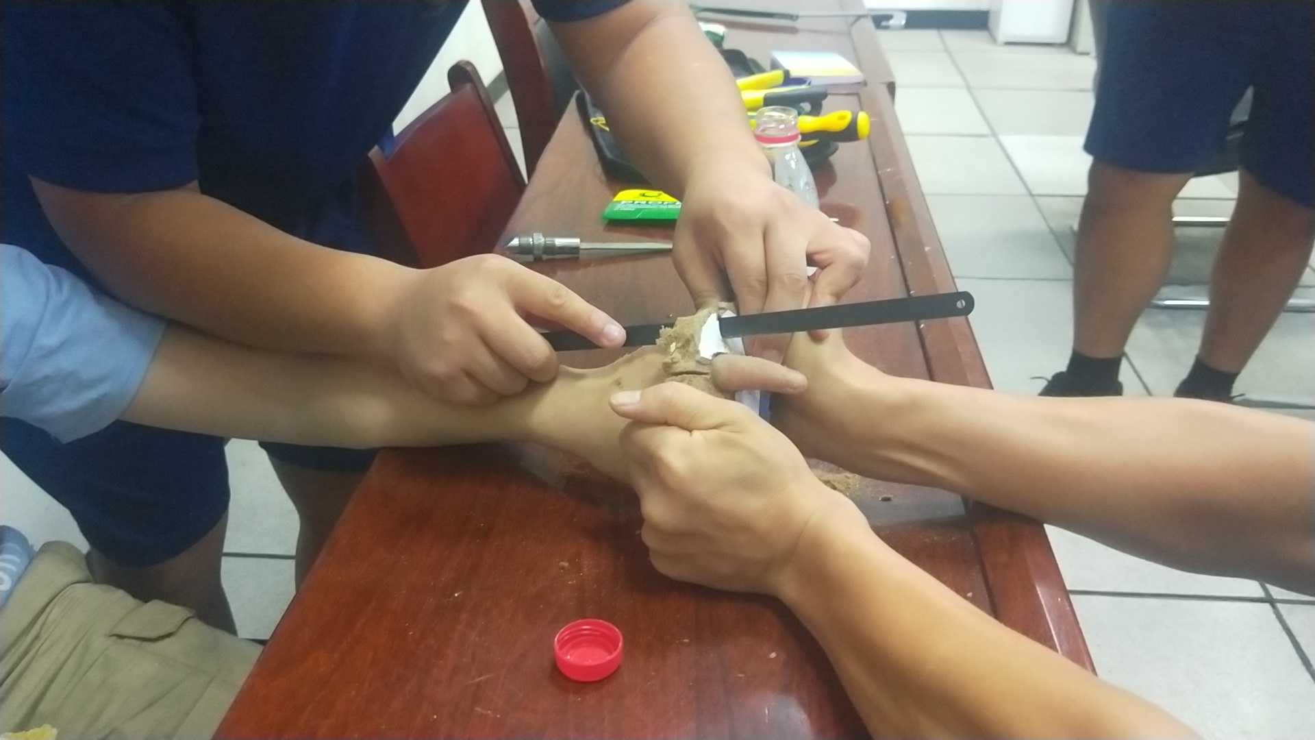 看到救援人員,小男孩十分害羞,有點(diǎn)不好意思?!拔铱醋雷由嫌袀€(gè)孔,就是想看看手指能不能伸進(jìn)去,結(jié)果就拔不出來了?!本仍藛T經(jīng)觀察發(fā)現(xiàn),小男孩左手無名指被卡在課桌木板上的小孔里,木板已被裁下,木板材質(zhì)為鋸末壓縮板,此時(shí)小男孩手指被卡部位周圍已發(fā)生腫脹必須馬上處理。救援人員利用鋼鋸將木板一點(diǎn)點(diǎn)鋸開,然后又用鉗子用力將木板夾開,經(jīng)過3分鐘救援,成功將禁錮小男孩手指的木板摘除??吹侥景灞粡氖稚先∠拢泻㈤L長地舒了口氣。