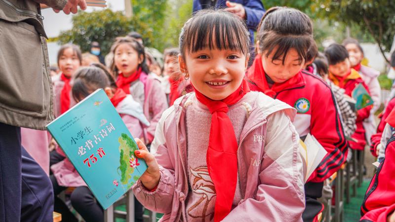 在看到擺在面前的幾百本書籍時,孩子們的眼睛更亮了。散發(fā)著油墨清香的一本本新書遞到了孩子們手中,有經(jīng)典名著、古文詩詞,還有寓言故事、科普傳記等等。興奮地翻閱著手中的書籍,孩子們不由自主地念出聲來:“繁星閃爍著,深藍的太空,何曾聽得見他們對語,沉默中,微光里,他們深深的互相頌贊了……”優(yōu)美的詩句撫慰著孩子們的心靈,滋養(yǎng)著他們的精神世界。