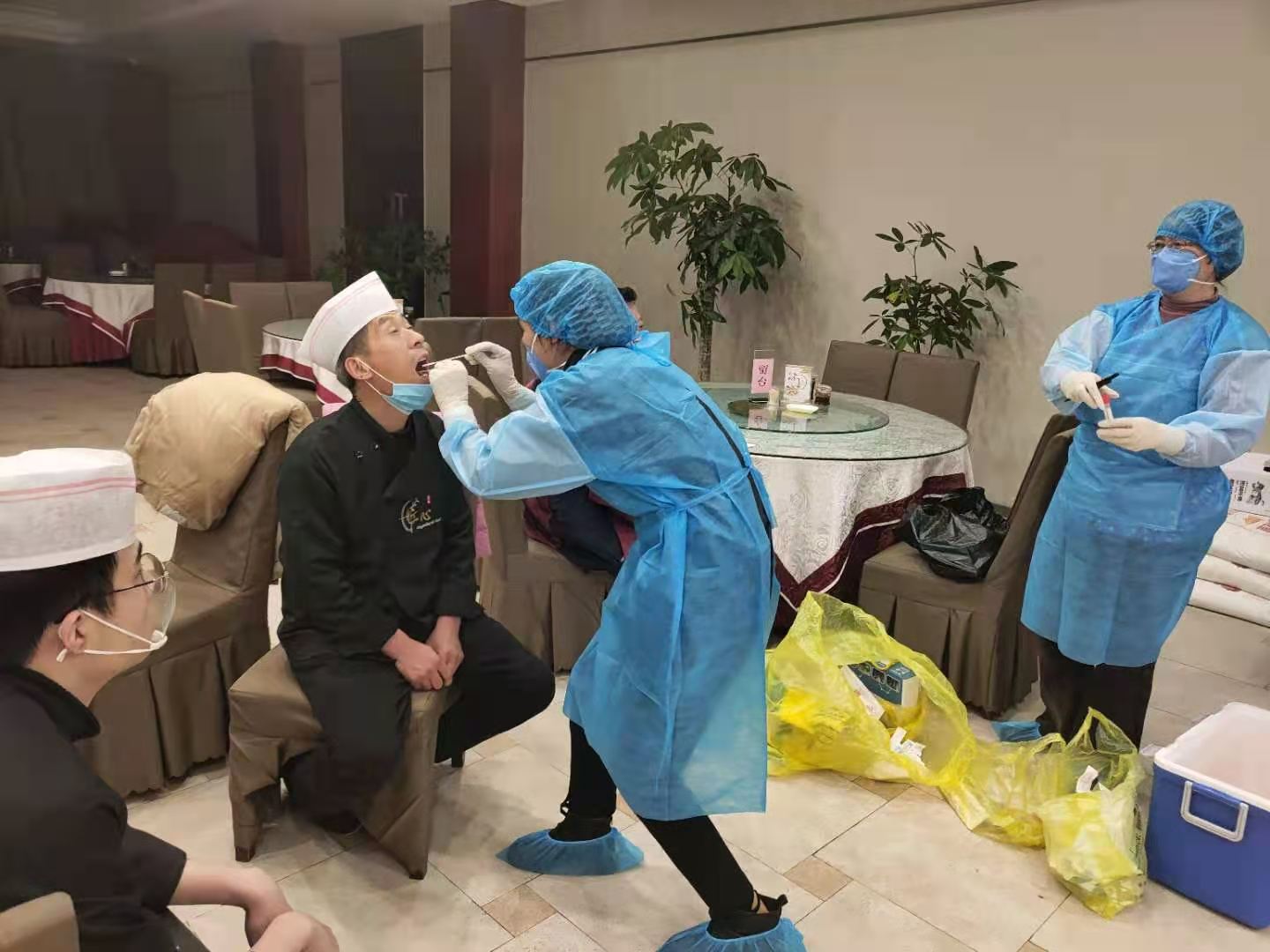 為助力第一屆周商大會圓滿成功,市衛(wèi)生健康委抽調近百名調精兵強將組成衛(wèi)生保障專班開展衛(wèi)勤保障工作。圖為工作人員在市委黨校迎賓館和體育賓館餐廳對后廚人員做核酸檢測及開展冷鏈食品消毒。