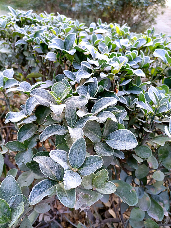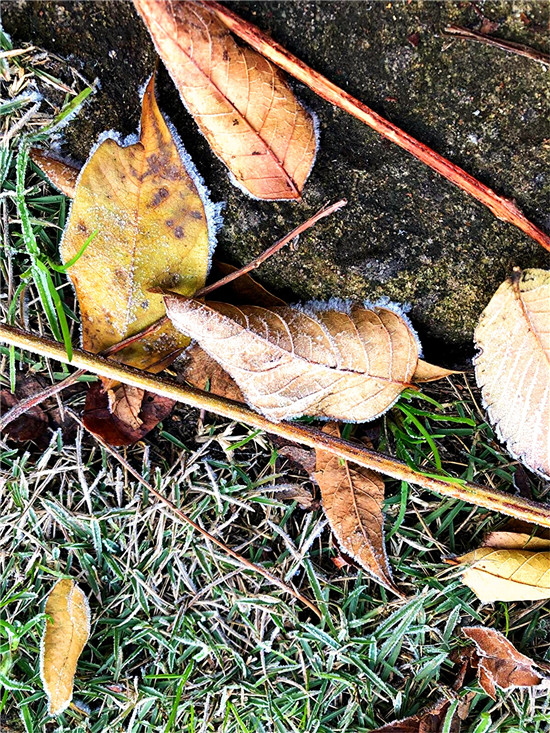 百草今何妝?茫茫著華霜。寒煙鎖素艷,疾步量路長(zhǎng)。12月4日早晨,我市下霜了,潔白的華霜就像一層薄紗,在陽光的映照下分外美麗。