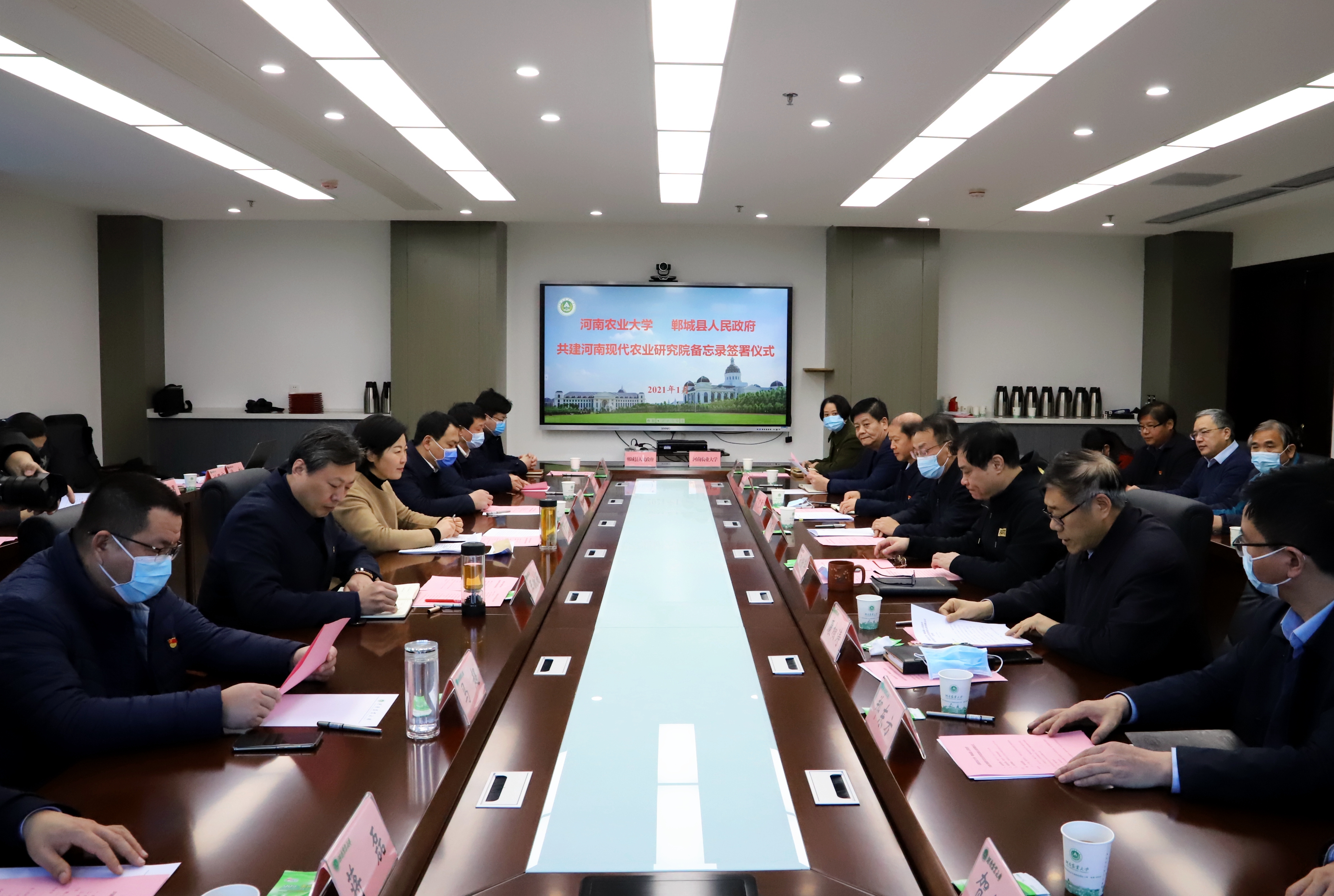 1月8日,鄲城縣人民政府、河南農(nóng)業(yè)大學(xué)共建河南現(xiàn)代農(nóng)業(yè)研究院備忘錄簽署儀式在河南農(nóng)業(yè)大學(xué)龍子湖校區(qū)舉行。河南農(nóng)業(yè)大學(xué)黨委書記魏蒙關(guān),中國工程院院士、校長張改平,校黨委副書記、副校長介曉磊,周口市人大常委會副主任、鄲城縣委書記羅文閣,縣領(lǐng)導(dǎo)李全林、王獻(xiàn)超、王偉、馬超、劉輝、蔣磊等參加簽約儀式。河南農(nóng)業(yè)大學(xué)副校長康相濤主持簽約儀式。