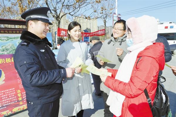 今年1月10日是第35個(gè)“110宣傳日”,也是首個(gè)“中國(guó)人民警察節(jié)”。我市公安系統(tǒng)圍繞“一心為民110,砥礪奮進(jìn)新征程”這一主題,開(kāi)展了大型宣傳活動(dòng)。圖為扶溝公安民警向群眾發(fā)放宣傳資料。
