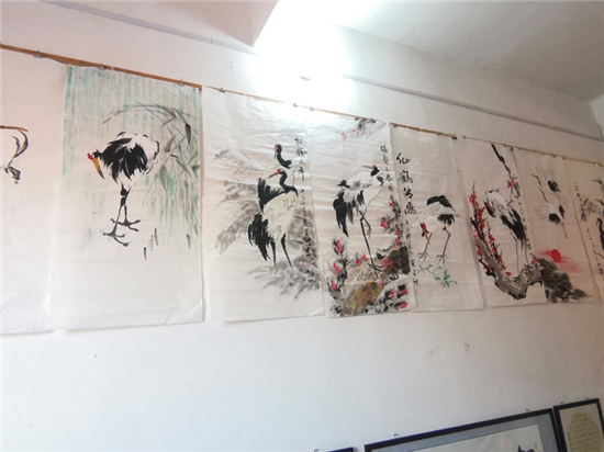 在建豪工作室的斜對面,是50歲村黨支部書記、村文聯(lián)主席盧全禮的書畫工作室。盧全禮書畫兼擅,還會武術(shù)、木刻、舞獅子,是附近有名的才子。記者看到,他為太康縣第二屆農(nóng)民豐收節(jié)創(chuàng)作的中國畫《黃土地的心聲》,以該村嗩吶吹奏藝人幸福而夸張的演出情景,歌頌農(nóng)村脫貧攻堅取得的巨大成果,極具鄉(xiāng)土氣息。在他的畫室,滿身文藝范兒的五西村民,正以新時代松鶴延年吉祥農(nóng)民畫,齊心打造中原畫鶴第一村。經(jīng)過培訓(xùn)的農(nóng)村大嫂大媽執(zhí)筆齊描畫,一時鶴鳴九皋,翩翩欲飛。