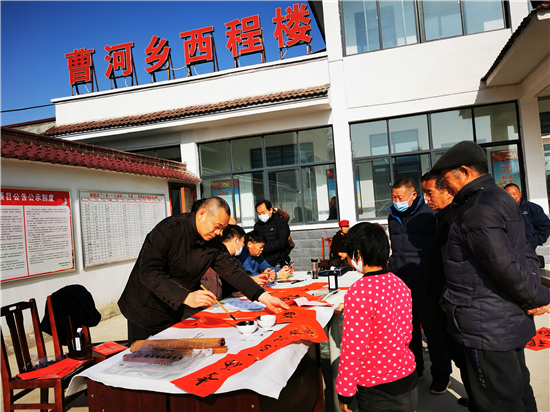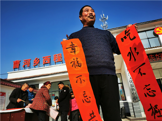 “吃水不忘掘井人,幸福不忘共產(chǎn)黨"。1月30日上午,在淮陽區(qū)曹河鄉(xiāng)程樓村,村民孫訓濤領(lǐng)到春聯(lián)后邊念邊樂,脫貧后的幸福生活溢于言表。當天,淮陽區(qū)文聯(lián)組織書法家下鄉(xiāng)義寫春聯(lián),受到群眾熱烈歡迎。