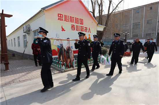 隨著春節(jié)日益臨近,該派出所所長楊杰和大家商議,“送溫暖送祝福”活動(dòng),應(yīng)該先從尊老愛幼開始。于是,民警們購買了60斤魚、100斤雞蛋和2袋面粉,利用中午休息時(shí)間來到敬老院,給老人們送上新春祝福。
