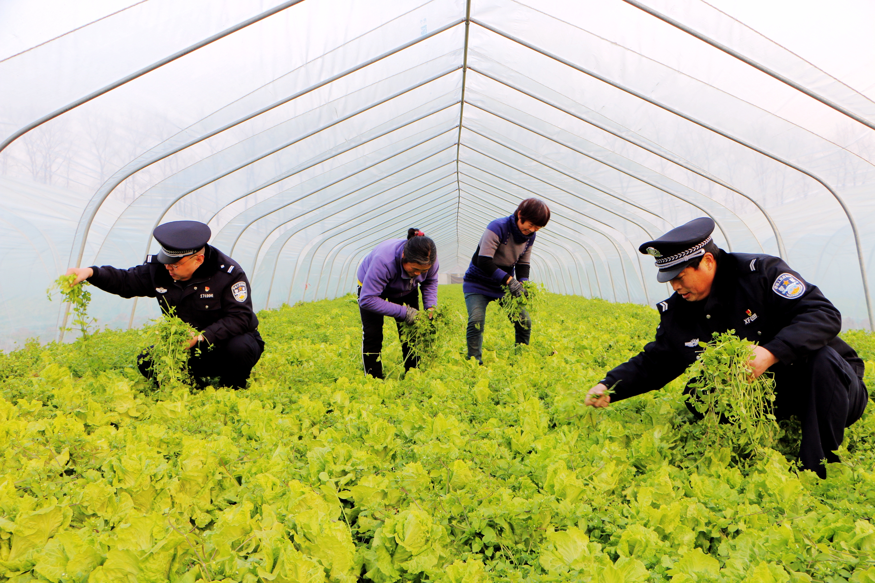 2月1日,商水縣公安局平店派出所民警到該鄉(xiāng)蔬菜種植園了解貧困戶經(jīng)濟(jì)收入情況,積極為貧困戶出點(diǎn)子、想辦法,爭(zhēng)取讓貧困戶早日脫貧。圖為民警在幫助貧困戶拔草。