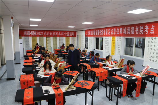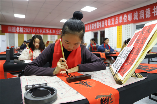 2月3日,記者在鄲城縣潤德書院看到,“我為我家寫春聯(lián)”活動正緊張地進(jìn)行著,數(shù)十名書法小學(xué)員端坐案前、從容執(zhí)筆、揮毫作書,一個個福字工整又靈活,一副副對聯(lián)娟秀又詩意。孩子們在屋內(nèi)全神貫注地寫字,把最美好的祝福用自己的所學(xué)展示給家庭;家長們在窗外掂腳張望,望子成龍、望女成鳳的心態(tài)表露無遺。