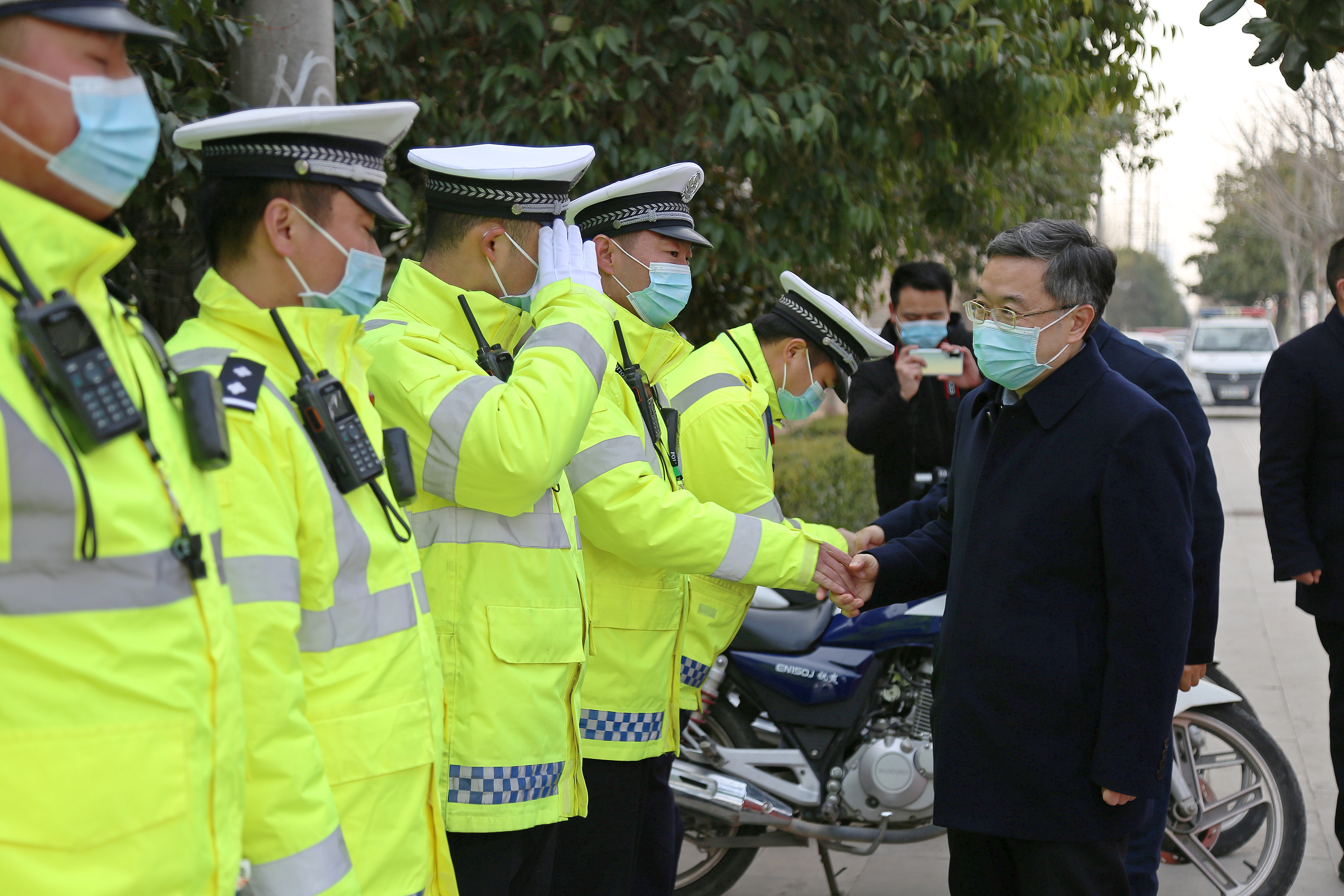 在縣交警大隊(duì)城區(qū)新區(qū)中隊(duì)五岔路口執(zhí)勤點(diǎn),皇甫立新、劉國(guó)慶同正在執(zhí)勤的交通民警一一握手,并代表縣四個(gè)班子向交警大隊(duì)全體民警、協(xié)警一年來(lái)付出的努力和辛苦表示感謝和問(wèn)候,囑咐他們要注意安全,保重身體。在詳細(xì)聽(tīng)取春節(jié)期間治堵保暢工作情況匯報(bào)后,皇甫立新對(duì)交警大隊(duì)全體民警和輔警在春節(jié)期間舍小家為大家,始終堅(jiān)守崗位保暢通的工作態(tài)度,以及無(wú)私奉獻(xiàn)、任勞任怨的工作作風(fēng)給予高度評(píng)價(jià)。并希望大家在春節(jié)期間,繼續(xù)發(fā)揚(yáng)吃苦耐勞的精神,科學(xué)做好道路安全保障工作,克服車(chē)多人多等困難,確保春節(jié)期間全縣道路交通安全暢通,讓全縣人民愉快度過(guò)一個(gè)平安、祥和的春節(jié)。同時(shí)要求縣交警大隊(duì)要進(jìn)一步做好執(zhí)勤民警后勤保障及防寒保暖工作,加強(qiáng)人員輪換上崗,切實(shí)保障公安交警切身利益,解決他們的后顧之憂(yōu)。