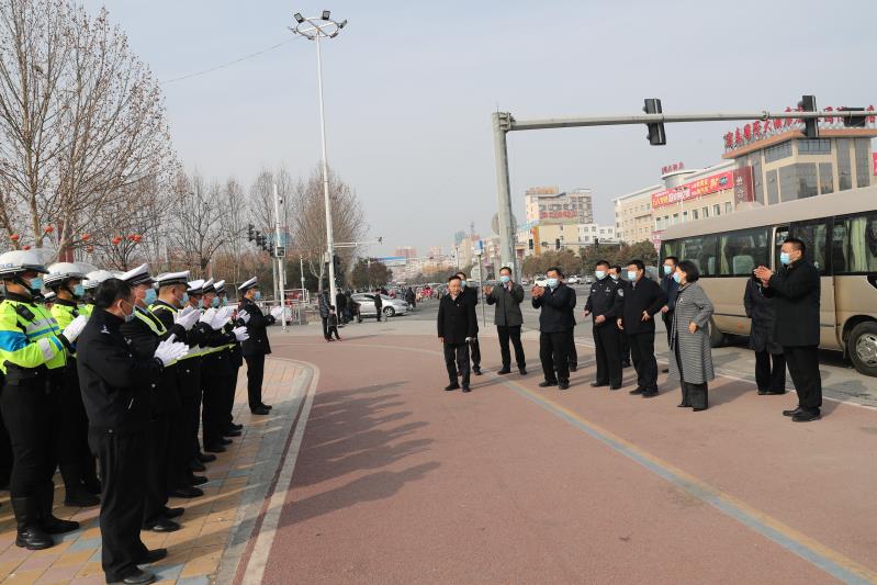 在縣人民廣場,最后王國璽、李錫勇一行看望慰問了正在執(zhí)勤的交警,與他們親切交談,對大家一年來作出的努力和貢獻(xiàn)表示感謝。勉勵廣大干警發(fā)揚甘于奉獻(xiàn)、勇于擔(dān)當(dāng)?shù)木?,維護(hù)好全縣社會大局穩(wěn)定,確保全縣人民度過一個歡樂祥和的節(jié)日。