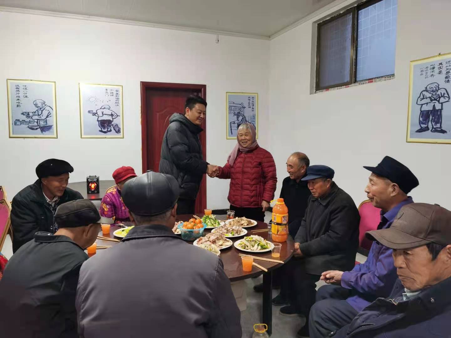 2月11日,除夕夜,《沒有共產(chǎn)黨就沒有新中國》的歌聲回蕩在太康縣毛莊鎮(zhèn)王隆集居村聯(lián)養(yǎng)點(diǎn)的上空。餐廳內(nèi)水果、飲料、白酒、四葷、四素八個(gè)涼菜和雞塊、丸子八個(gè)熱菜整齊地?cái)[放在桌子上。