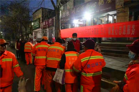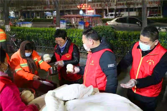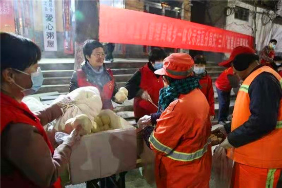 當(dāng)日早上5時(shí),在愛心粥屋里,示范區(qū)分局的志愿者們穿著紅馬甲,戴上口罩,立即進(jìn)入忙碌狀態(tài),大家既分工明確又相互配合,現(xiàn)場井然有序。他們?yōu)榄h(huán)衛(wèi)工人盛飯端菜,拿雞蛋饅頭,動(dòng)作迅速,熱情周到,有條不紊,個(gè)個(gè)忙得不亦樂乎。在這個(gè)清冷的早晨,因?yàn)橛辛藷釟怛v騰的飯菜和志愿者忙碌的身影,環(huán)衛(wèi)工人開心地笑容,感受到濃濃暖意。