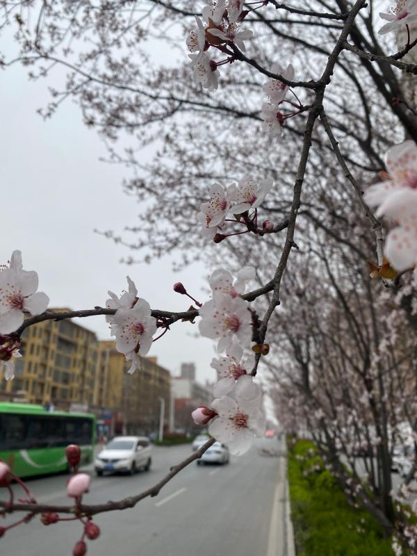 紫葉粉白花綻放,簇?fù)頋嵮乓绶枷恪7郯椎男』ㄟB成了一道亮麗風(fēng)景線,充滿春天的色彩和味道。