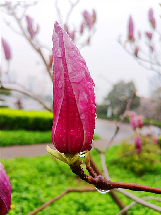 “霓裳片片晚妝新,束素亭亭玉殿春。已向丹霞生淺暈,故將清露作芳?jí)m?!?月11日,我市下了一場(chǎng)小雨,路旁的紫玉蘭更顯晶瑩玉潤(rùn),朵朵玉蘭花如雨后新荷般清麗脫俗,或含苞待放、欲語(yǔ)還休,或花瓣盡展、舞姿翩翩,令人不禁駐足欣賞。