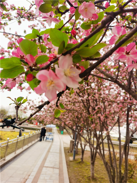 日前,周口公園里的海棠紛紛綻放。在公園內(nèi)的道路上,海棠已進(jìn)入盛花期,粉色的花朵如夢(mèng)似幻,令人沉醉。