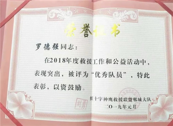 鄲城縣神鷹救援隊(duì)隊(duì)長劉勇說,正是看到了羅德強(qiáng)的優(yōu)秀品質(zhì),2018年將羅德強(qiáng)吸納為神鷹救援隊(duì)員?!吧聱椌仍?lián)盟鄲城大隊(duì)隸屬于中國神鷹救援隊(duì),由各個(gè)行業(yè)的志愿者組成,也是河南省成立最早的一支民間救援隊(duì),除參加全國各地災(zāi)后救援活動外,日常積極參加社會志愿者活動。”“我一個(gè)人的力量很有限,加入這個(gè)優(yōu)秀集體,能夠?qū)W到更多專業(yè)救援知識,從而幫助更多的人,我感到非常驕傲和自豪?!绷_德強(qiáng)說。2019年8月10日,受第九號臺風(fēng)“利奇馬”影響,山東省壽光市、東營市等部分地區(qū)遭受洪災(zāi)。8月11日晚上,紅十字神鷹救援聯(lián)盟鄲城大隊(duì)趕赴山東壽光救災(zāi)。面對洪災(zāi),羅德強(qiáng)和其他救援隊(duì)員不畏辛苦,劃船深入各個(gè)受災(zāi)鄉(xiāng)村救助被困群眾。壽光市一鄉(xiāng)鎮(zhèn)3處大閘因斷電出現(xiàn)險(xiǎn)情,需要人力進(jìn)行開閘泄洪。羅德強(qiáng)和隊(duì)員冒險(xiǎn)攀爬到大閘上進(jìn)行人工作業(yè),經(jīng)過3個(gè)多小時(shí)的奮戰(zhàn),3處大閘全部打開,安全泄洪。2019年9月1日,參加泳渡日月潭返程途中,羅德強(qiáng)在福建高速公路上,發(fā)現(xiàn)前方車輛發(fā)生車禍,一名司機(jī)腿部骨折、血流不止。他立即下車和司機(jī)溝通,一邊報(bào)警,一邊利用專業(yè)救援知識打開變形的車門,順利將司機(jī)救出。“由于過度驚嚇,司機(jī)以骨折為由拒絕下車。當(dāng)我告訴司機(jī)自己是神鷹救援隊(duì)員、救援技術(shù)過硬后,才同意我們施救?!碑?dāng)時(shí)高速上車流密集,情況十分危險(xiǎn),如果司機(jī)不能及時(shí)救出,后果不堪設(shè)想?!拔覀冘囕v加油、住宿、吃飯等救援費(fèi)用都是隊(duì)員AA制負(fù)擔(dān),從來不給當(dāng)?shù)卣蚓戎颂砣魏温闊??!?/p>
