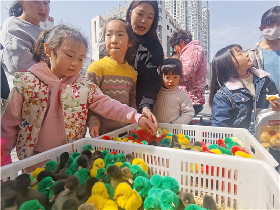 3月21日,在城區(qū)五一路口,幾個(gè)售賣小雞小鴨的攤位前吸引了不少市民。所售賣的小雞小鴨被染上了紅色、黃色、綠色等色彩艷麗的顏色,憨態(tài)可掬的小雞小鴨尤其受到了孩子們的喜愛,不時(shí)有過往行人駐足詢問價(jià)格。
