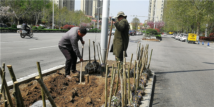 仲春時(shí)節(jié),我市積極打造街頭游園、口袋公園,增加市民休閑游樂場(chǎng)所。圖為園林工人正在施工。②7