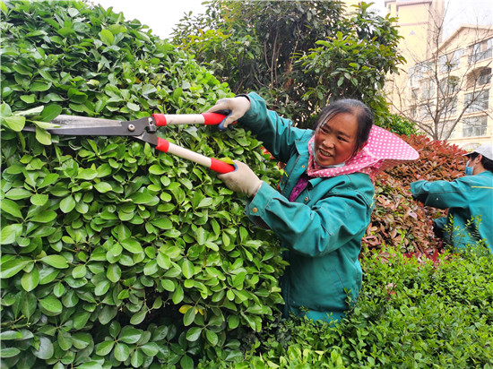 圖為社區(qū)物業(yè)人員在修剪綠植。
