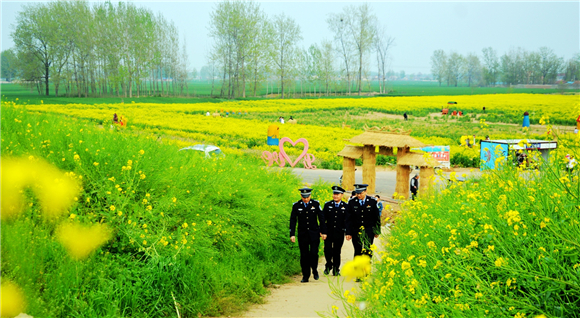 4月10日上午,商水縣公安局組織民警在鄧城鎮(zhèn)6000多畝油菜花海中執(zhí)勤巡邏,疏導(dǎo)交通,確保游客安全。當(dāng)日,商水縣首屆金色花田樂游匯暨農(nóng)特產(chǎn)品展銷會(huì)開幕式在此舉行。來自市內(nèi)外的數(shù)萬名游客到這里踏青賞春。