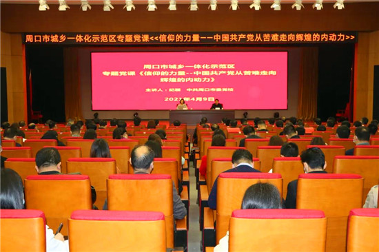 為貫徹落實習近平總書記黨史學習教育動員大會重要講話精神,全面推進全區(qū)黨史學習教育工作,4月9日上午,周口市城鄉(xiāng)一體化示范區(qū)組織專題黨課學習,邀請中共周口市委黨校黨史黨建教研室主任,副教授紀穎講授《信仰的力量——中國共產黨從苦難走向輝煌的內動力》專題黨課,示范區(qū)副處級以上干部、區(qū)直全體黨員干部、鄉(xiāng)、辦、站、所負責人、全體村(社區(qū))支部書記參加會議。