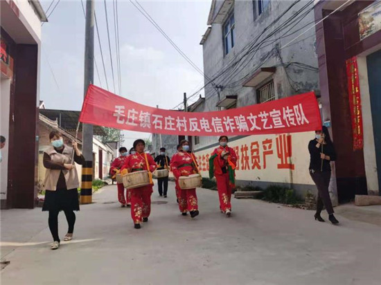 “父老鄉(xiāng)親聽(tīng)我說(shuō),現(xiàn)在騙子真是多。莫占便宜要牢記,發(fā)家致富靠自己……”毛莊鎮(zhèn)石莊村這樣一支反電詐文藝宣傳隊(duì)瞬間吸引了人們的眼球?!艾F(xiàn)在我村的年輕人大部分都出去掙錢去了,在家的大部分是老人,我們幾個(gè)一合計(jì)把宣傳單上的內(nèi)容編成順口溜,這樣更好懂、更好記!”石莊村文藝宣傳隊(duì)的張秀芬笑著說(shuō)。