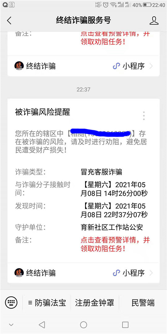 截至目前,洺南街道“金鐘罩”反詐預警系統(tǒng)注冊人數(shù)達21929人,受保護居民29547人,成功勸阻155人次免受電信網(wǎng)絡詐騙,取得了良好的社會效果。①9