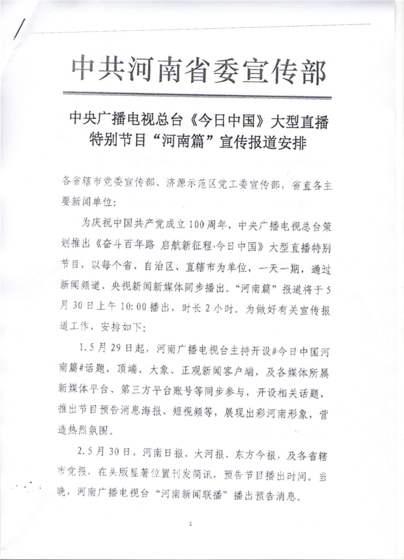 中央廣播電視總臺《今日中國》大型直播特別節(jié)目“河南篇”宣傳報道安排