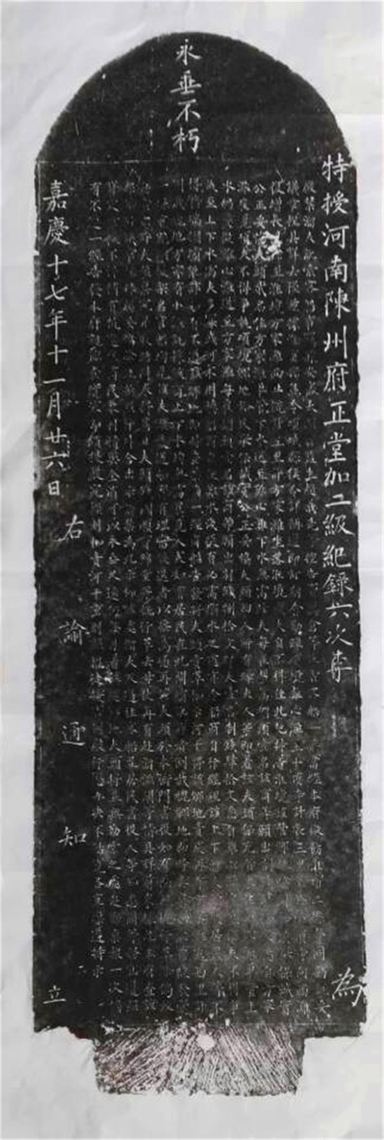 說它“緘默不語”,其實并不準確。這通石碑通體有字,碑的陽面為清同治八年四月十六日淮沈項分縣縣丞孫茂悟所刊刻的嚴禁溜夫訛索客船事告示,碑的陰面為附文,內(nèi)容為重刊的清嘉慶十七年十一月二十六日陳州知府李振翥制定的嚴禁溜夫訛索客船事章程,是對公告內(nèi)容的重申,兩面碑文內(nèi)容大致相同,加起來共有1100余字,均為約束溜夫行為的公告或章程。碑首追刻的有四個大字:永垂不朽。