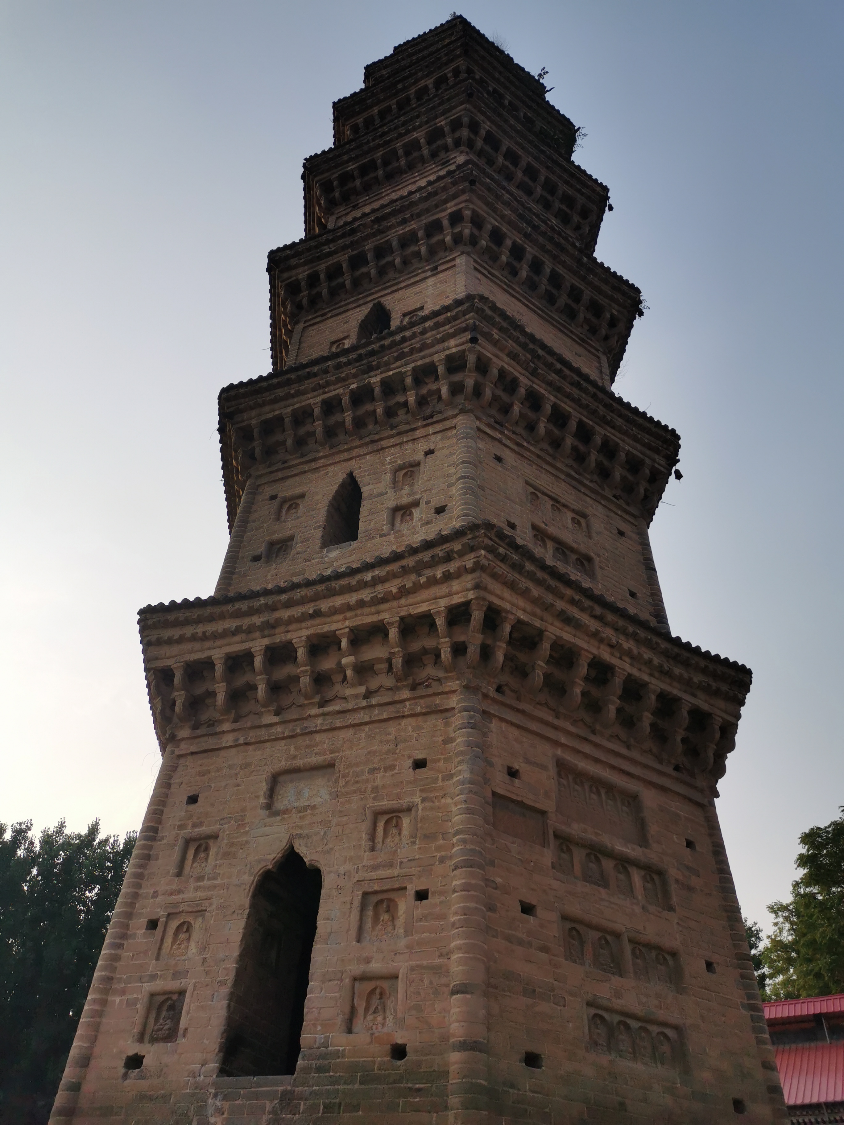 太康壽圣寺塔,高28.3米,為六角形七級樓閣式磚塔,上有塔剎。塔身第七層為實心,一至六層為空心,但層與層相隔互不相通,在南面辟圭形門,檐下均置磚雕斗拱。塔身南面正墻除第七級外均有真門,每層檐下都飾有磚雕斗拱,塔身共嵌砌石雕佛像211尊、石刻題記14方。
