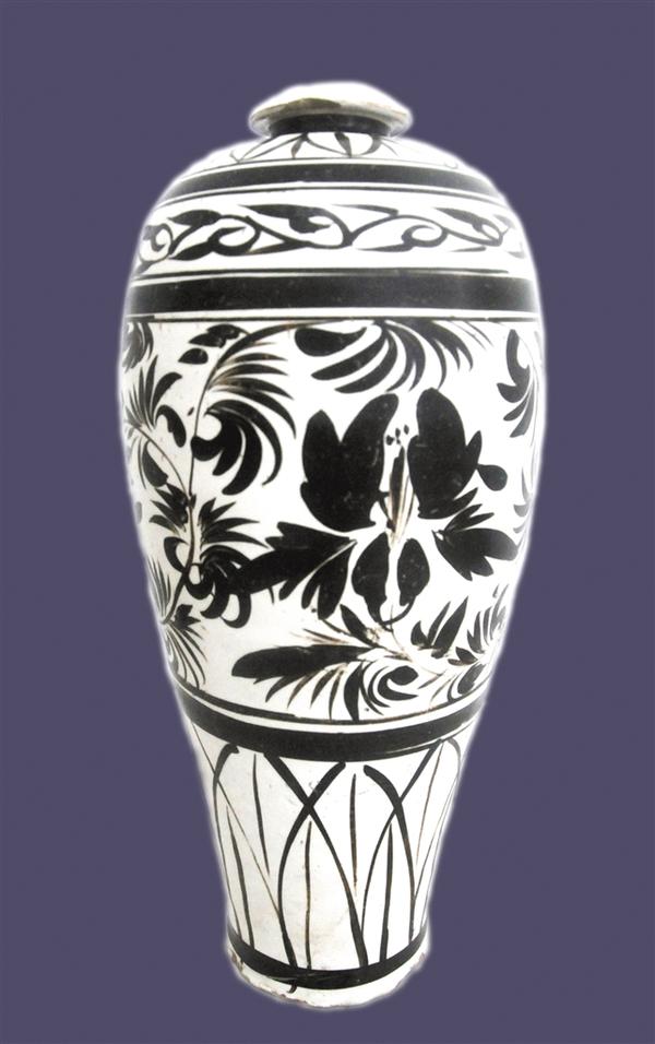 磁州窯,在今河北省磁縣,因其古屬磁州而得名,影響范圍較廣,北方各地紛紛效仿,形成了龐大繁雜的磁州窯體系,主要分布于河南、河北和山西等地,由宋、遼、金延續(xù)至元、明、清。磁州窯系以白地黑彩瓷器著稱于世,做工精致巧妙,器型端莊工整,黑白對比強(qiáng)烈,圖案鮮明醒目,簡練生動,形成了磁州窯系特有的紋飾風(fēng)格。磁州窯系的梅瓶,整體紋飾繁而不亂、典雅秀美,更是磁州窯系瓷器中之上品佳作,也是我國古代陶瓷藝術(shù)的名貴品種。