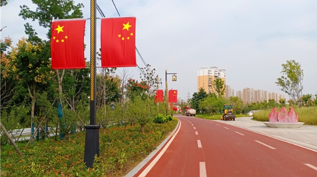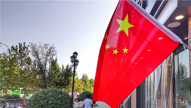 ?9月30日,市區(qū)臨街商鋪門前五星紅旗隨處可見,紅旗隨風(fēng)飄揚(yáng),將街道裝扮一新,喜迎國(guó)慶節(jié)的到來(lái)
