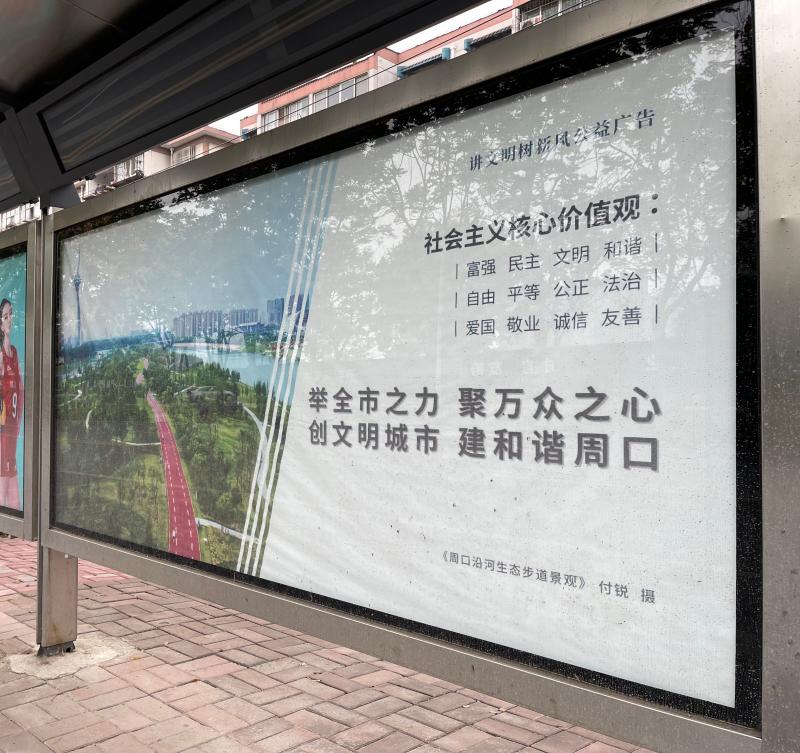 周口市公交總公司總經(jīng)理助理朱懷彬表示,為確保文明標(biāo)語能讓市民抬眼可見、駐足即觀,目前,我市中心城區(qū)公交候車臺的公益廣告牌投放覆蓋率已超過50%?!盁ㄈ灰恍碌墓徽九_,既扮靚了周口的城市面貌,提升了市民的出行體驗(yàn),又潛移默化地把社會主義核心價(jià)值觀根植于市民內(nèi)心?!敝鞈驯蛘f。②10