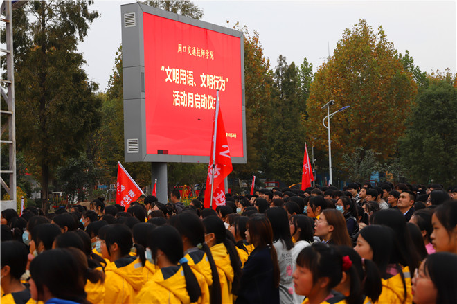 “我是周口交通技師學(xué)院的一名學(xué)生,從今天起,我要講禮儀、懂禮貌、不說(shuō)臟話……積極參加“文明用語(yǔ)、文明行為”主題實(shí)踐活動(dòng),爭(zhēng)做文明學(xué)生?!?0月26日,周口交通技師學(xué)院全體師生在學(xué)院“文明用語(yǔ)、文明行為”活動(dòng)月動(dòng)員會(huì)上集體宣誓。師生們堅(jiān)定的目光和錚錚的誓言,展現(xiàn)出青年學(xué)子講文明話、辦文明事、做文明人的堅(jiān)定決心。
