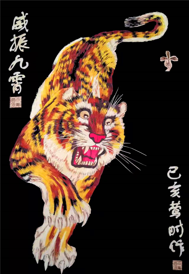 據王春梅介紹,畫中老虎身上所有的虎毛全部是用秸稈先染色,然后把這些染好顏色的秸稈用剪刀剪成人頭發(fā)絲一半粗細的虎毛形狀,再用鑷子一根一根地層層嵌上去,需要盤絲的毛發(fā)所花費的功夫更是成倍地增加。最終所呈現出來的老虎栩栩如生,極具觀賞性。