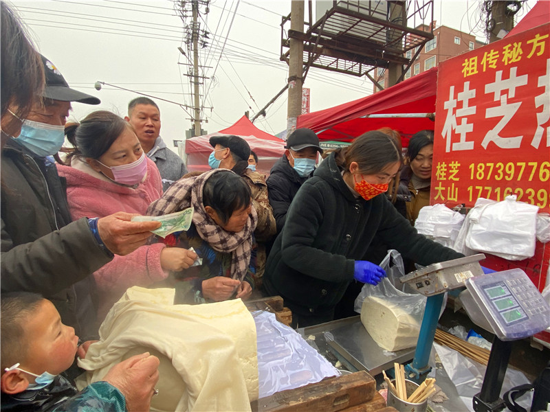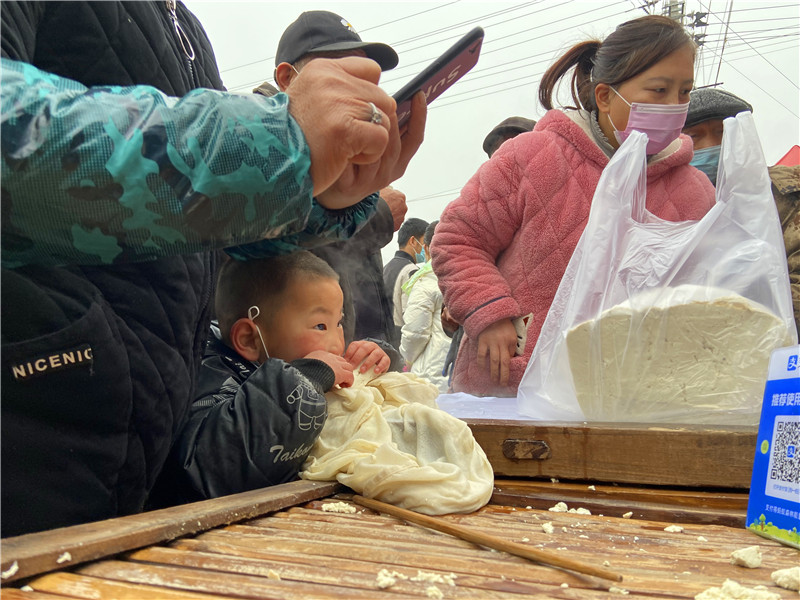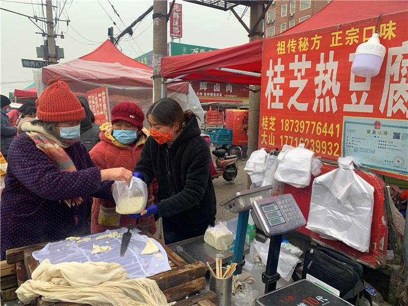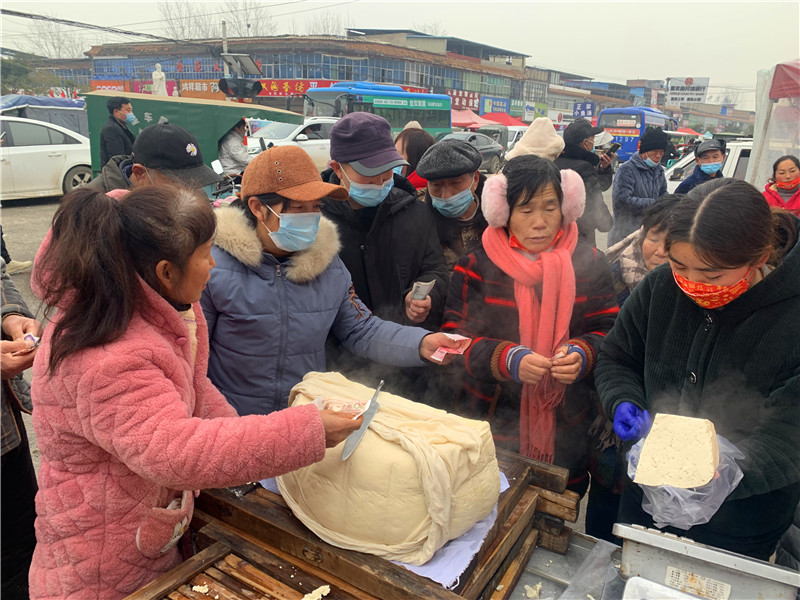 在固墻鎮(zhèn)的集市上,“桂枝熱豆腐”攤位前的顧客絡(luò)繹不絕?!敖o我來50塊錢的豆腐”“我要20斤,先給我切豆腐吧”“我要30斤,多少錢”……人群將豆腐攤里三層外三層圍了起來,從人群外朝里看看不見豆腐,只看到豆腐攤里冒出來的團(tuán)團(tuán)熱氣?!暗攘税雮€小時了,剛才那一盒豆腐沒輪到我就賣完了,這才搶到手。”附近的村民楊大爺拿著剛買的豆腐高興地說?!拔覐穆挂貋淼?,姐姐在里面擠著買豆腐,我在這兒等她呢?!?歲的張家瑞說,她每年放寒假都會和家人一起到固墻來探親,過年的時候逛逛集市,順便買些豆腐帶回鹿邑。