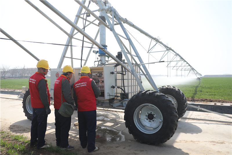 放眼望去,一座座白色的標(biāo)準(zhǔn)化通電機(jī)井房坐落在麥田地頭,源源不斷的井水流進(jìn)蓄水池里,不斷冒出歡快的水花。一旁的大型電動(dòng)平移式噴灌機(jī)把井水過濾后,澆灌出一片片盎然綠意。遠(yuǎn)處身穿紅馬甲、頭戴安全帽的供電檢修人員正在對(duì)抽水專變進(jìn)行認(rèn)真細(xì)致地檢查。