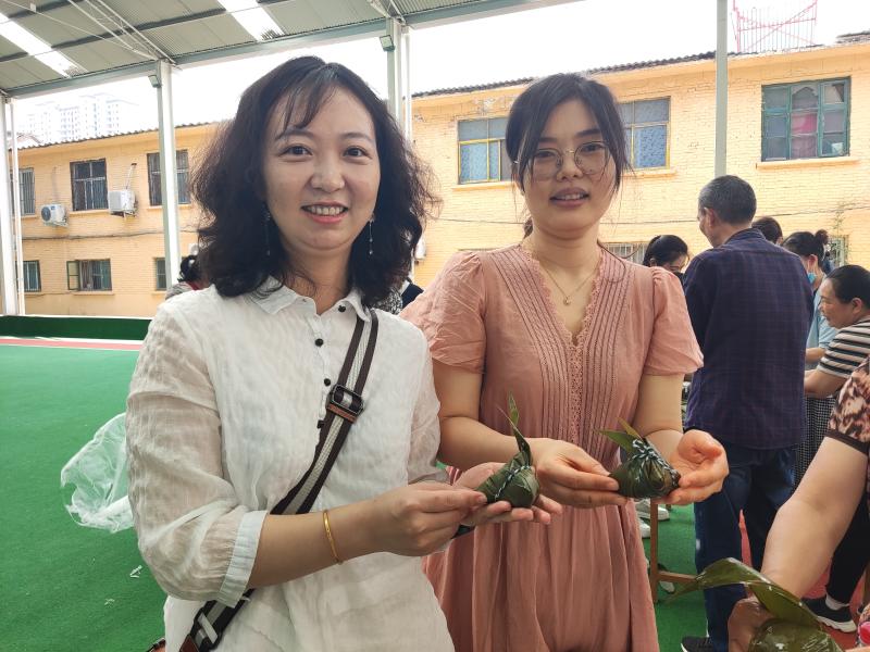“雖然我平常很少包粽子,但還是挺簡(jiǎn)單的?!蔽乃蓮?qiáng)邊說邊包,用繩子將粽子纏繞好,用牙咬住繩子的一頭,一手拿粽子,另一手將繩子打結(jié)。整個(gè)過程一氣呵成,引來不少人前來學(xué)習(xí)。