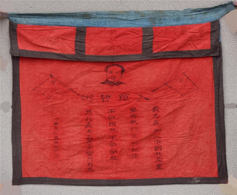 在德高民俗博物館,陳列著這樣一面旗幟,旗身長約90厘米,寬約70厘米,旗幟上印有毛澤東同志頭像及入黨誓詞文字,旗幟左下方印有“八路軍抗戰(zhàn)指揮部制”落款文字,該入黨誓詞旗幟為抗日戰(zhàn)爭時(shí)期制作完成。凝視這面旗幟,對革命先烈的欽佩感油然而生。