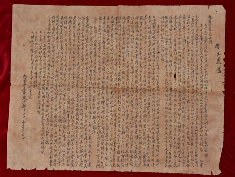 1928年7月22日,彭德懷領(lǐng)導(dǎo)湘軍獨(dú)立第五師第一團(tuán)等部于湖南省平江城起義。不久,部隊(duì)即奉命改編為中國工農(nóng)紅軍第五軍第十三師。1930年6月,紅五軍在湖北省大冶縣編入紅三軍團(tuán)。根據(jù)《紅軍第五軍政治部告工農(nóng)書》的落款時(shí)間及內(nèi)容可以看出,此布告落款時(shí)間為1930年3月20日,它是研究紅五軍開展農(nóng)民工作、宣傳工作和紅五軍光輝歷史的重要史料佐證。